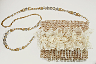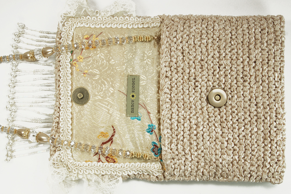 of a pale beige shimmering ribbon yarn. The flap is adorned with long strands of white pearlized beads and a row of very soft and feminine lace ruffle with a row of ivory woven flowers down the center of the ruffle.
