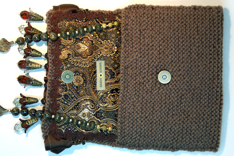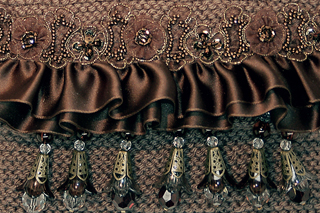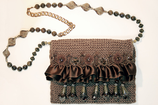 The embellishment on the top flap consists of two rows of brown satin ruffle that is topped with a bronze and taupe metallic trim that is detailed with soft brown organza daisies.