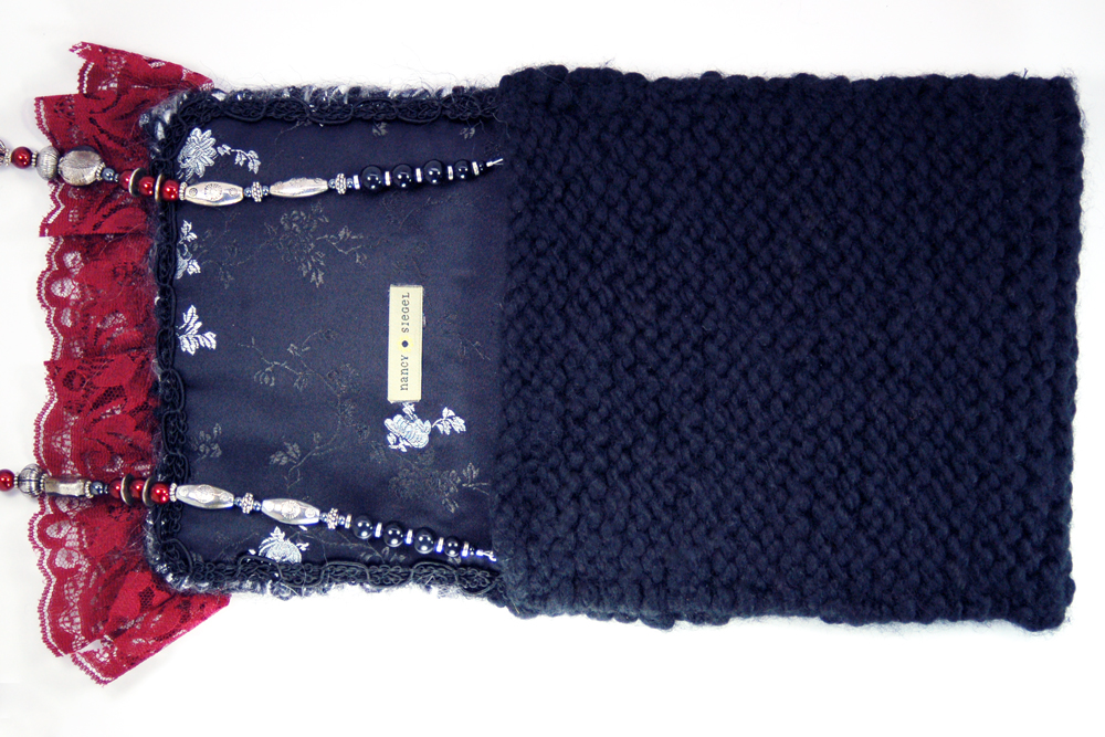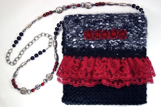 of various yarns. The body of the purse is knitted with a soft black yarn, while the top flap is made with an irridescent silver