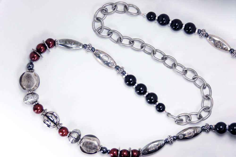 with black, silver and red beads, with a silver tone chain that allows the purse to rest comfortably on the shoulder.