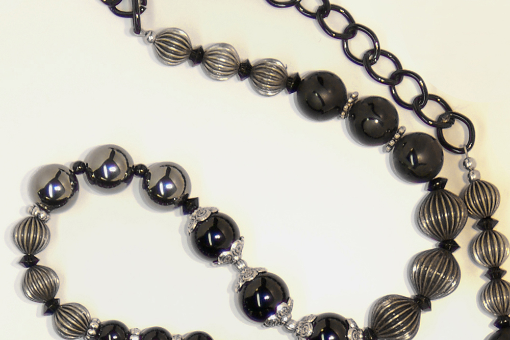 a multitude of black, silver and hematite beads. A black chain allows the purse to rest comfortably on the shoulder. In addition, the strap is removable, allowing the bag