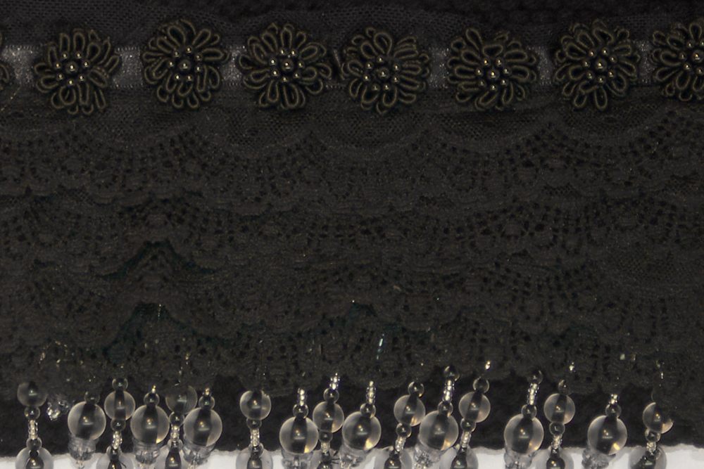 The embellishment on the top flap consists of four layers of soft black lace that are topped with black woven zinnia flowers with black beaded centers. Peaking out from below the lace are long hanging strands of black and translucent beads.