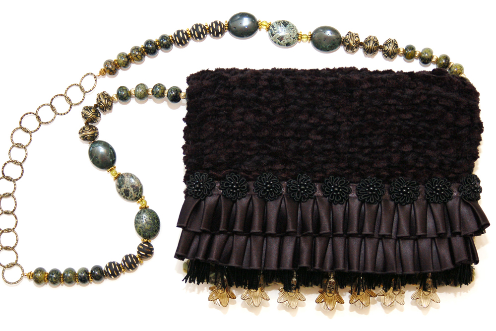 The flap of the purses is constructed of soft black chenille yarn. The embellishment on the top flap consists of a row of black fringe, a double row of black satin ruffle, which is topped with a fow of black carnations. The carnations have black beaded centers. Hanging beads, topped with dark green metallic caps hang below the fringe.