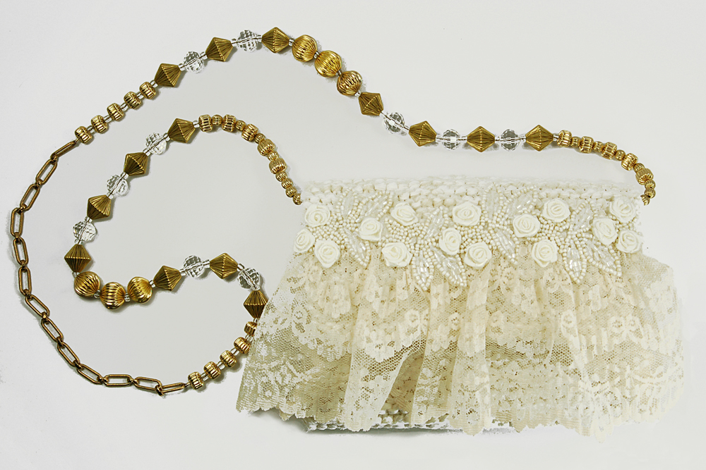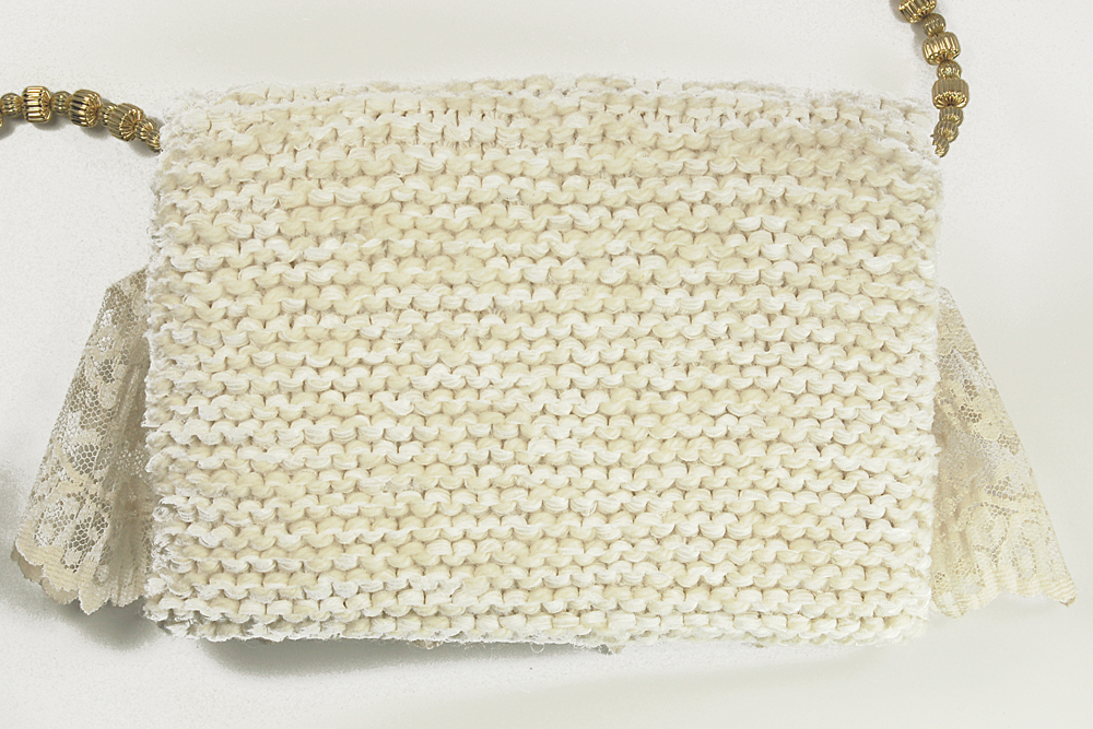 Ivory Lace measures 7"W X 5"H. It is created with a very soft ivory yarn in combination with a white ribbon yarn. The embellishment on the top flap consists of a row of wide ivory lace that is topped with a row of beautiful beaded trim dotted with soft ivory miniature roses.The interior of the bag is lined with a soft white satin fabric that coordinates beautifully with the body of the purse.The strap is 37" long. It is designed with