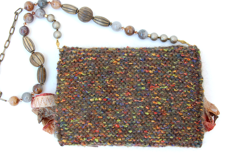 Jade Ruffle is one of the larger bags, measuring 8"W X 7"H. It is created with two yarns; a very soft forest green yarn in combination with a multi-colored jewel tone irridescent ribbon yarn. The embellishment on the top flap is trimmed with a multi-colored soft silky feminine ruffle. The ruffle is bordered by a row of soft peach organza rosettes.The interior of the bag is lined with a soft green fabric with accents of color that coordinate beautifully with the body of the purse.The strap is 34" long. It is designed with