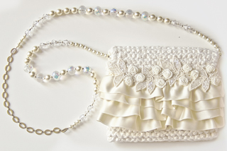 Matrimonial Ruffle measures 6.25"W X 5.25"H. It is created with a very soft textured ivory yarn. The embellishment on the top flap consists of a 4 rows of ivory satin ruffle that is topped with a row of beautiful beaded trim dotted with soft ivory miniature roses.The interior of the bag is lined with a soft white satin fabric that coordinates beautifully with the body of the purse.The strap is 37" long. It is designed with varying sizes of faceted glass beads and pearls. A gold-colored chain allows the purse to rest comfortably on the shoulder. In addition, the strap is removable, allowing the bag to be carried as a clutch. The purse has a magnetic snap closure.For additional information about Matrimonial Ruffle, please email me. I'd love to hear from you!nancy@nancysiegelpurses.com |