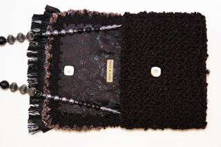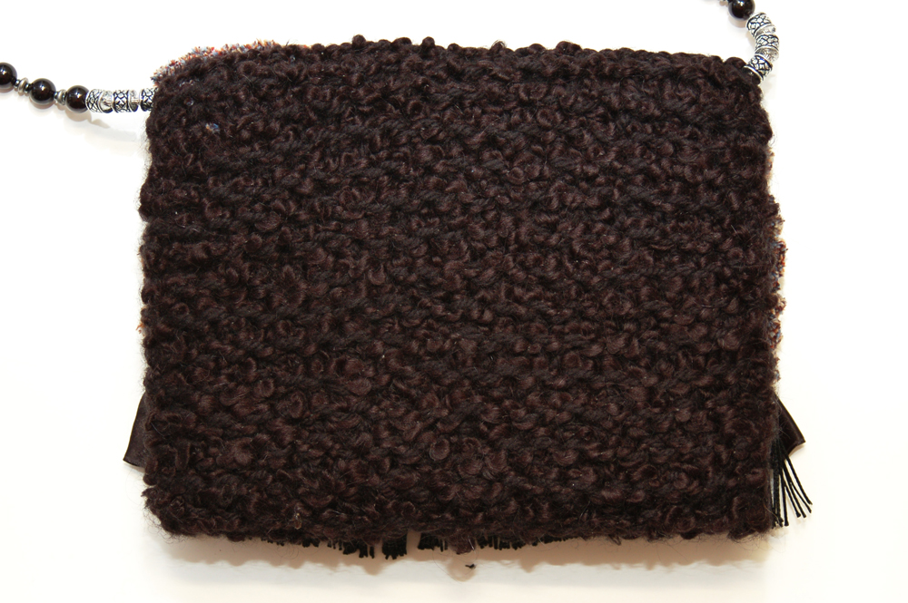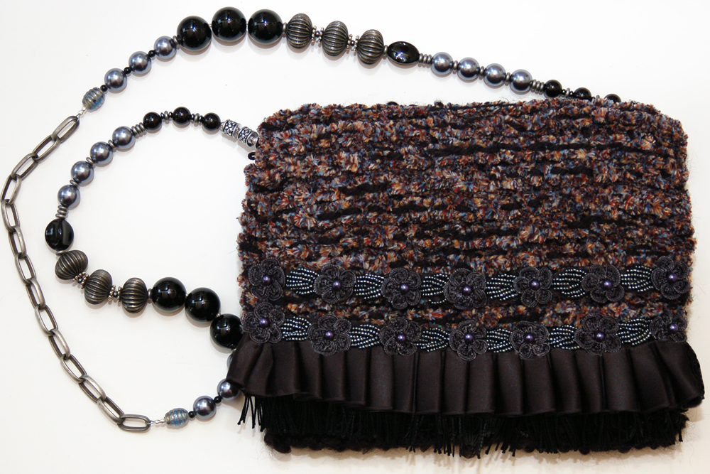 The body of the purse is constructed from a very soft black textured yarn, while the flap of the purse is a soft chenille yarn of multiple shades of blue, red and tan. The embellishment on the top flap consists of a row of black fringe, topped with a row of black satin ruffle and the finally topped with two rows of embroidered gunmetal colored flowers with patches of hematite