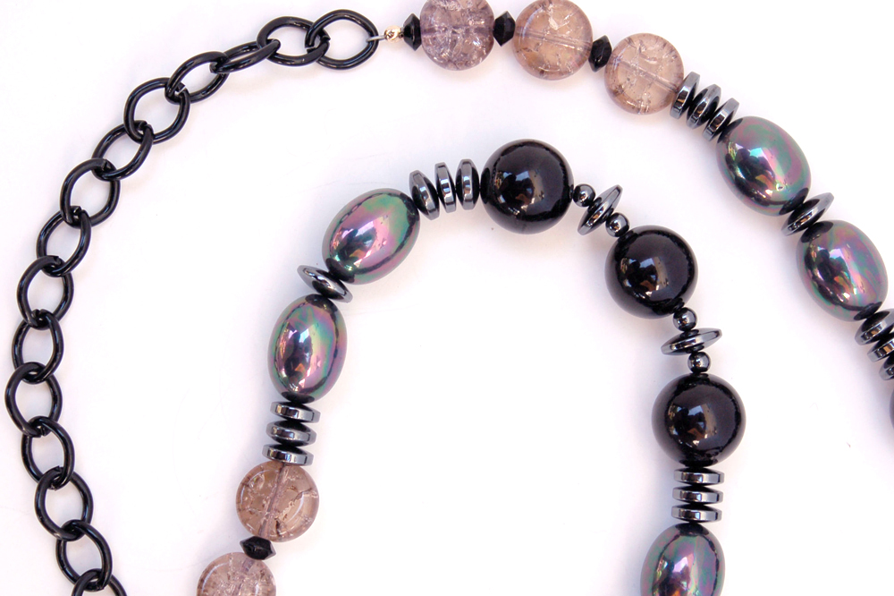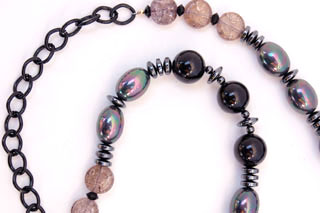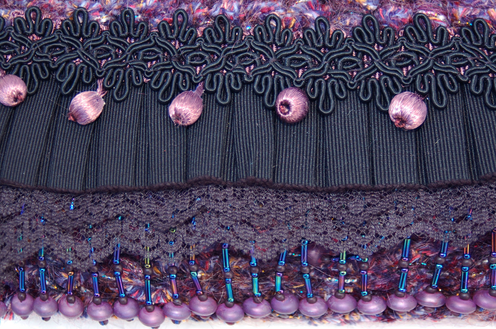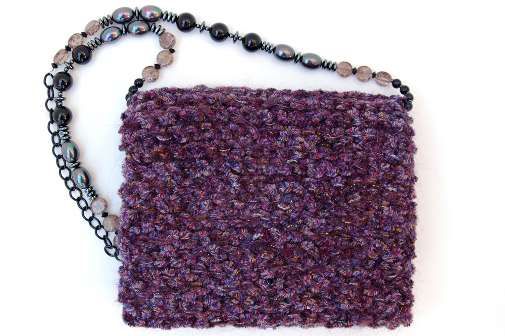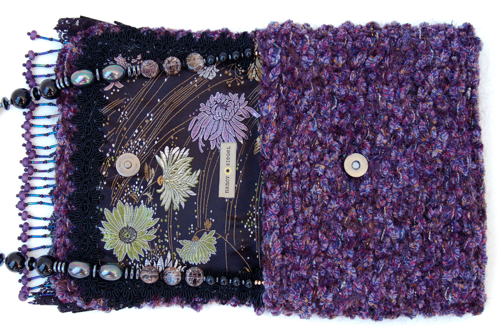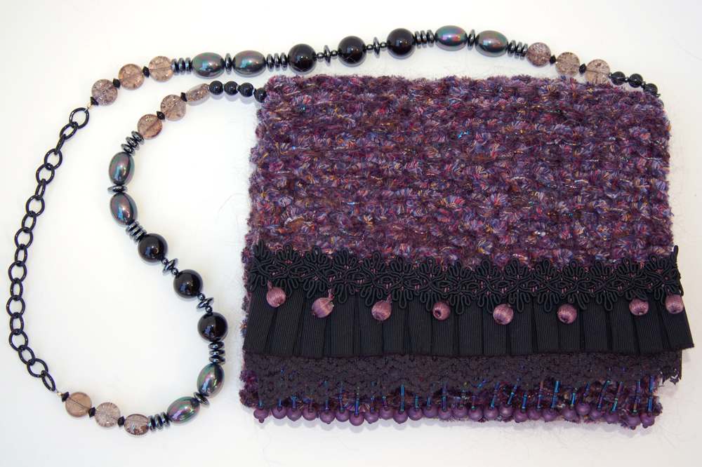 Mulberry Bauble measures 8.5"W X 8"H. In deep raspberry and black this purse is the perfect addition to a solid black outfit that asks for a beautifully rich color accent. It is created with a very soft purple chenille yarn that feels luscious to the touch. Scattered sparkles add a subtle brightness to this already gorgeous bag. The embellishment on the top flap consists of 5 different layers, starting with a row of deep, irridescent beads that dangle with a deep raspberry bead at the end. The following layer of black lace is perfectly topped with a pleated grosgrain ruffle. The addition of delicate fabric beads in deep raspberry are followed on top with a delicately feminine lace applique.The inside is lined with a perfectly selected patterned fabric that has a black background and accents of sage green and lavender.The strap is 32" long. It is comprised of a combination of black, hematite and rose glass beads. A black chain allows the purse to rest comfortably on the shoulder. In addition, the strap is removable, allowing the bag to be carried as a clutch. |
