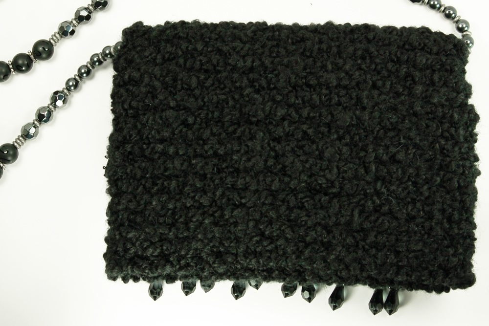 Ruffled Rose measures 7.5"W X 6"H. It is created with a very soft black textured yarn. The embellishment on the top flap consists of a row of hanging black tear drop beads that is topped with a black trim. Following is a double row of organza and satin ruffle. The top row is a puckered black satin ruffle, dotted with black satin rosettes.The interior of the bag is lined with a soft black on black patterned fabric that coordinates beautifully with the body of the purse.The strap is 38" long. It is designed with