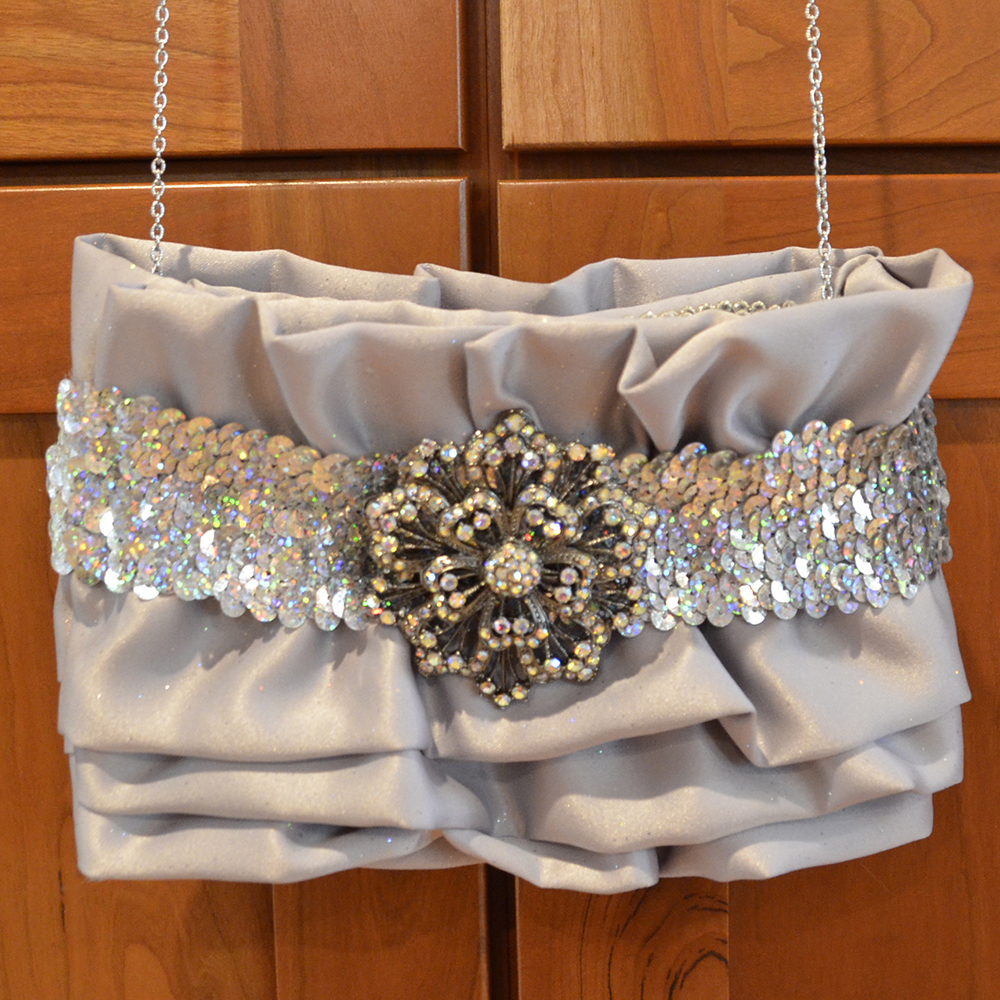 "Silver Sequin" measures 8"W x 5 1/2"H and is constructed both inside and out of a very pale grey satin fabric with subtle glitter within the fabric. The front of the bag is layered with soft ruffles in the same fabric as the body of the bag. A sequin band wraps around the whole bag, about one inch from the top. A rhinestone pin sits in the center of the band on the front of the bag. A removable silver chain drops the purse about 20" from the shoulder.For additional information about "Silver Sequin", please email me. I'd love to hear from you!