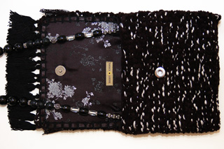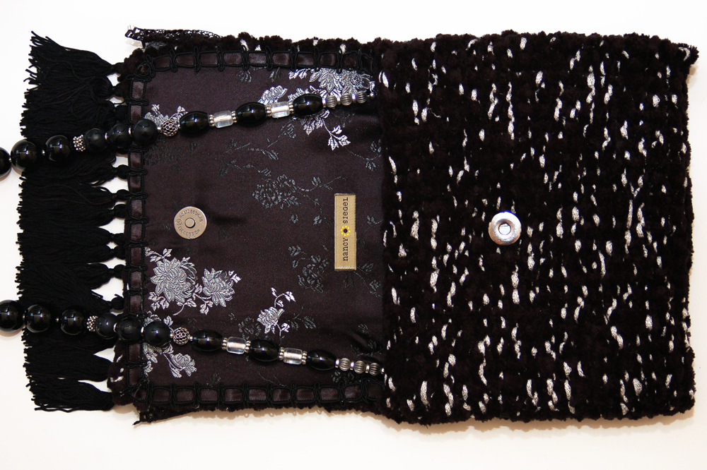 Starlight Rose measures 8"W X 8"H. It is created with two yarns; a very soft black yarn in combination with soft silver yarn. The embellishment on the top flap consists of a row of black fringe bordered by silver flowers and topped with a row of black lace that is edged with black woven zinnia flowers.The interior of the bag is lined with a silky black and silver patterned fabric that coordinates beautifully with the body of the purse.The strap is 34" long. It is designed with